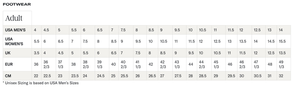 | US (Men's) | 4 | 4.5 | 5 | 5.5 | 6 | 6.5 | 7 | 7.5 | 8 | 8.5 | 9 | 9.5 | 10 | 10.5 | 11 | 11.5 | 12 | 12.5 | 13 | 14 |